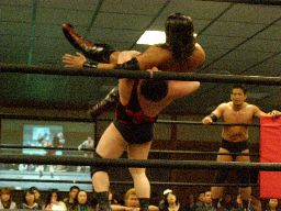 大鷲張り手、アントンかわして大鷲をバックドロップ(右写真)、コーナーに戻るとKooが自らタッチしてリングイン。