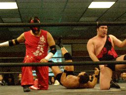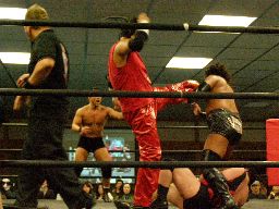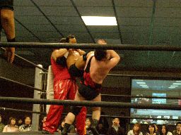 Kooが羽交い絞め、アントンが突っ込むが諸橋キック(左写真)。