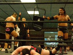 Kooがアントンにハワイアンスプラッシュマウンテン(左写真)、東郷が押さえ込む、カウント3。