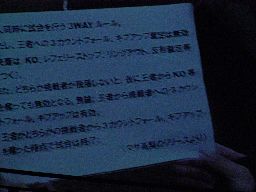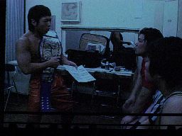 高梨リーダーがマイク(右写真)「ディーノ、ベルトで女性を殴るなんてひどいオカマだな!つーことでこのベルトは反乱軍の自分のもとに戻ってきた。そして今日こそ反乱軍の正式名称を発表する時だ!反乱軍の正式名称は・・・」坂井のテーマが鳴り響く。