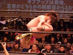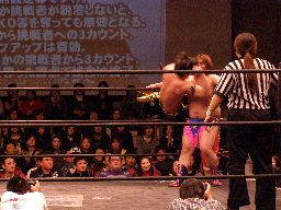 KUDOガットショット、首投げからサッカーボールキック(右写真)、ドロップキック、そして倒立式ダブルニードロップ、カウント2。