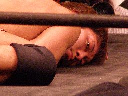 KUDOコーナーに振って8×4(左写真)、エプロンに出てダイビングダブルニーアタック、ディーノかわす。ディーノ突っ込む、KUDOジャンプするがそのヒザがディーノの顔面に。5分経過。