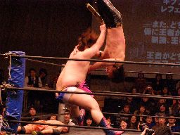 KUDOバズソーキック、カウント2。KUDOコーナーに上る、ディーノ起き上がってヴィーナス(右写真)。