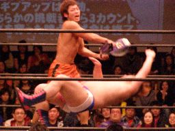 ディーノまた垂直落下式ブレーンバスター狙う、高梨リーダー首固め(右写真)、カウント2。高梨リーダーKUDOにスクールボーイ、カウント2。