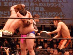 KUDOとディーノは高梨リーダーにダブルのブレーンバスター狙う、高梨リーダーは2人まとめてのDDTに切り返す(左写真)。