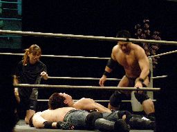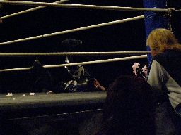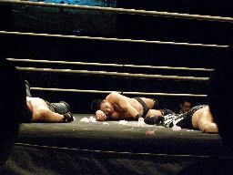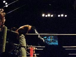 柿本は寝っ転がったままの伊東の上にダウン(右写真)、これをカバーとみなしグレースはカウント入れる、カウント2。
