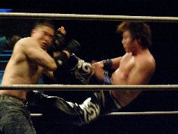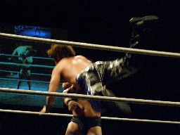 カウント9で立ち上がり伊東柿本にバックスピンキック(右写真)、カウント2。