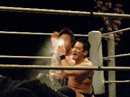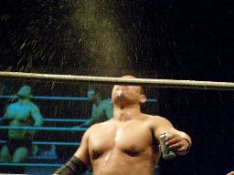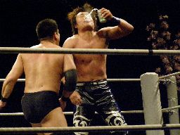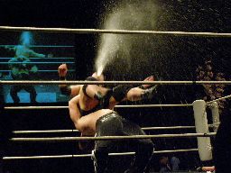 HARASHIMAファルコンアロー、カウント2。また一気、今度は高木が妨害(左写真)、HARASHIMA酒を噴く。