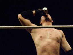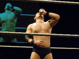 そしてまた一気(左写真)。「飲んだ!」と主張するがグレースのチェックでかなり残ってることが判明、試合続行。
