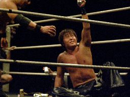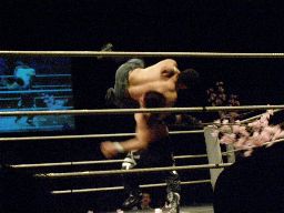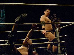 伊東ロープに飛ぶ、HARASHIMAジャンピングハイキック(左写真)、カウント2。