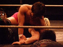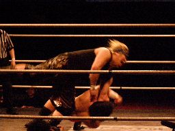 佐々木バック取る、ウラノ一旦ブレークするが佐々木はバック取ってジャーマン(左写真)、カウント2。