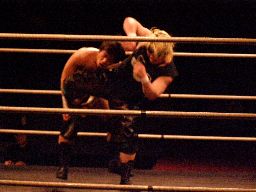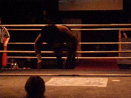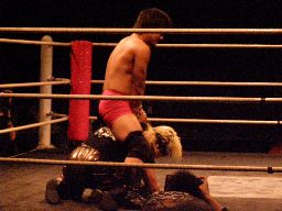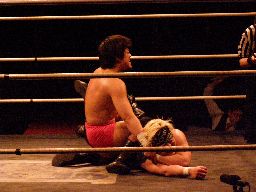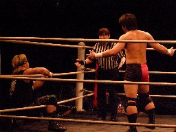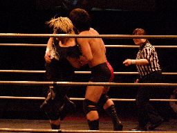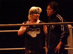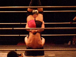 ロックアップ、佐々木ホイップ(左写真)。ウラノはレフェリーの李日韓に「髪!」とアピール。もちろん佐々木は髪などつかんではいない。再度ロックアップ、佐々木ホイップ。ウラノはまた「髪!」とアピールするが日韓は「今見てた」と取り合わず。