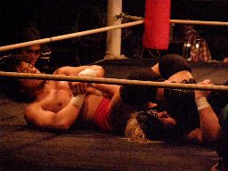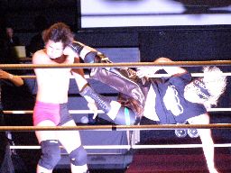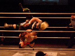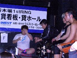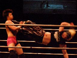 佐々木十字架固め(左写真)、カウント2。佐々木ウラカンホイップ、ウラノ場外転落。