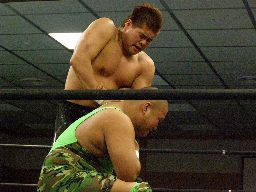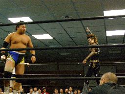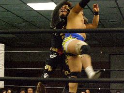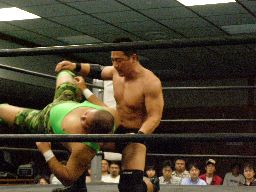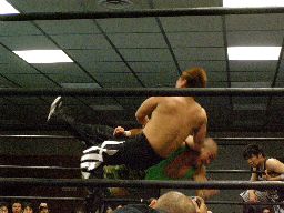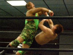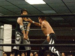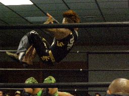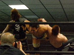 入江エルボー(右写真)、ポイズンもエルボー返す。柿本にタッチ。柿本エルボードロップ、逆片エビ。またポイズンにタッチ。