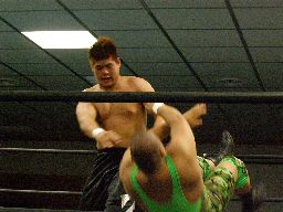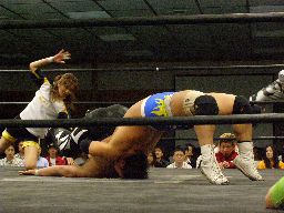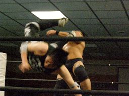 三度目のロックアップ、高木は潜り込んで飛行機投げ(左写真)、腕を固める。高木ヘッドロックからフライングメイヤー、笠木ヘッドシザーズでブレーク。高木再度フライングメイヤー、笠木ヘッドシザーズ。柿本と入江にタッチ。