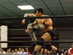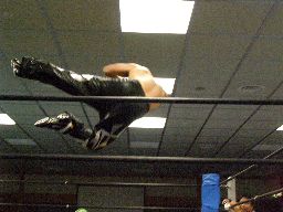 コーナーに上ってダイビングエルボードロップ(右写真)、カウント2。