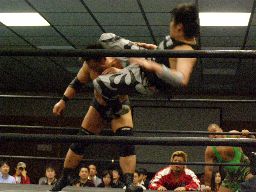 ポイズンが入江にチョークスラム、柿本が高井に裏投げ。高木と笠木が入る。笠木延髄蹴り連発(右写真)。