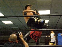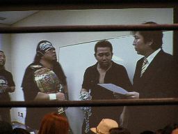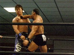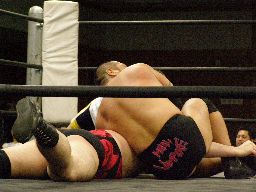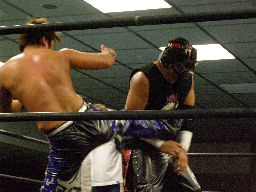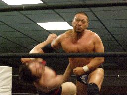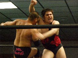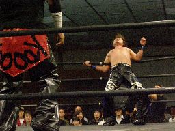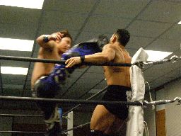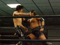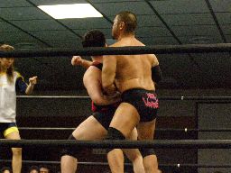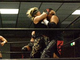 諸橋キック、ナックル、フィストドロップ、カウント2。大鷲にタッチ。ウラノ大鷲に逆水平連打(右写真)、大鷲は腕パンチ一発で倒す。大鷲Kooにタッチ。Kooストンピング、ニーリフト、ウラノが腹を押さえて倒れる。Kooカバー、カウント2。東郷にタッチ。東郷ロープに振ってキチンシンク、すかさずサマーソルトドロップ、カウント2。
