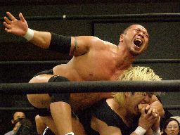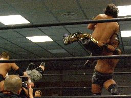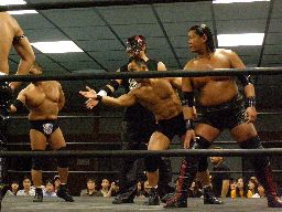 東郷がアントンをリングに戻しチョーク攻撃、踏みつけ(左写真)。アントンパンチ、東郷エルボースタッブ。Kooにタッチ、ダブルのレッグスプレッド。3人で踏みつけ。