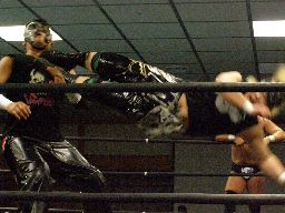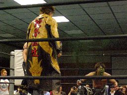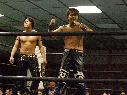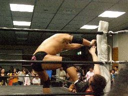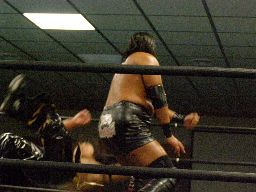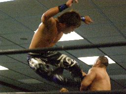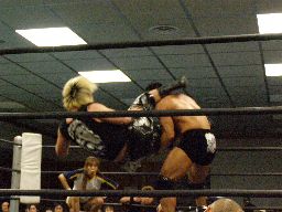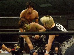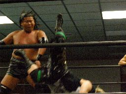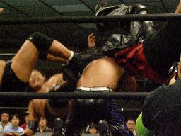 KUDOソバット、ヘッドロック、大鷲ロープに振る、KUDOショルダーブロック。大鷲ロープに飛んでショルダーブロック(右写真)。大鷲ロープに飛ぶ、KUDOカニばさみで倒す。HARASHIMAと諸橋にタッチ。