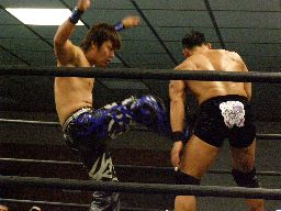 HARASHIMAが東郷にミサイルキック(右写真)、東郷もKooにタッチ。