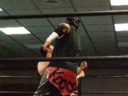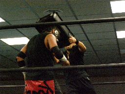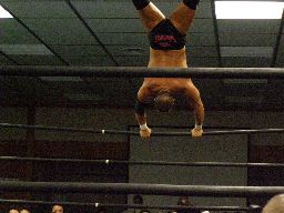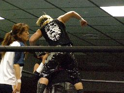 東郷ロープに振る、アントン切り返しパンチ連打からダスティ(右写真)。東郷がアントンを場外に出す。ここから乱戦に。