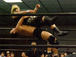 大鷲ロープに飛ぶ、ウラノはグレースを引き込んで延髄蹴り(右写真)。ウラノロープに飛ぶ、大鷲ビッグブーツ、ブレーンバスターからギロチンドロップ、カウント2。諸橋にタッチ。