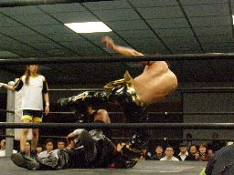 大鷲がウラノを首投げでロープ際に寝せ、東郷がエプロンからシルバーブレット(右写真)。