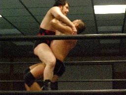 腕の取り合いから東郷ハンマーロック(左写真)、アントン切り返す。東郷ヘッドロック、フライングメイヤー、アントンヘッドシザーズ。東郷サミング。