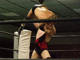 Kooチョークスラム狙う、KUDOブロックしてロープに飛ぶ、Kooヒップトス。Kooコーナーに振る、KUDO切り返して8×4、Kooがキャッチしてネックハンギングボムに(右写真)、カウント2。