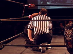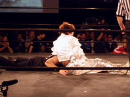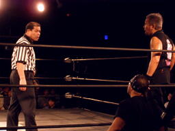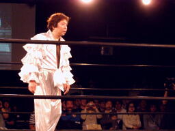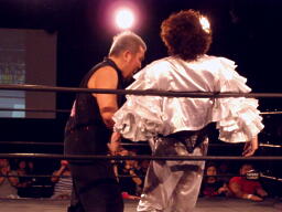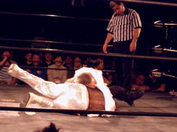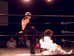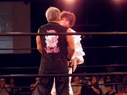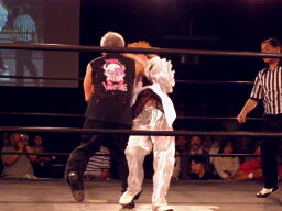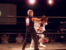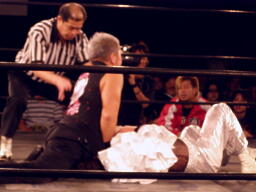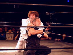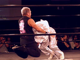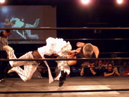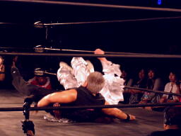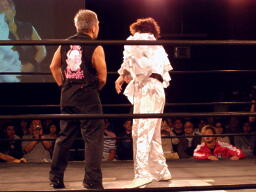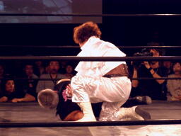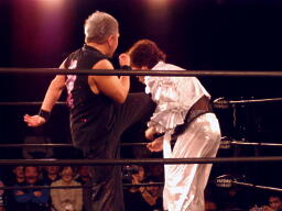 松井逆片エビ固め(右写真)、ゴージャスロープ。松井逆水平、コーナーに振って串刺しエルボー、さらにチョップ連打。