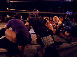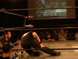 カットしようとするメタル・ヴァンパイヤ勢をKUDO、ウラノ、アントン、佐々木が入ってきて押さえる(左写真)。
