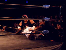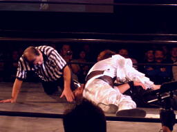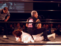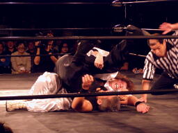 京平がKooに気を取られているスキに松井はバンデージでゴージャスの首を絞める(右写真)。カバー、カウント2。