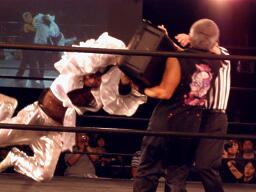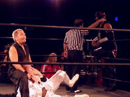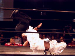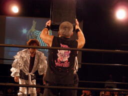 そこにゴージャス飛び込んでブラックボックスごとフライングクロスアタック(右写真)。京平は取り上げたブラックボックスをエプロンに上がって来たKooの頭に。MV勢が文句言うと「置いただけだろ!」まあ、そうだ。