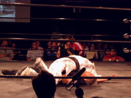 松井なんとか頭を抜くとスリーパーに、ゴージャス切り返してハンマーロック(右写真)。松井ロープ、そのまま場外エスケープ。