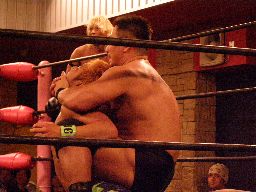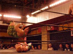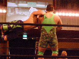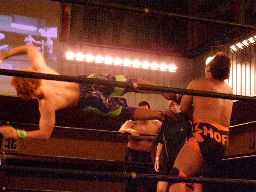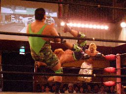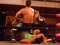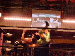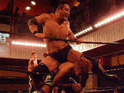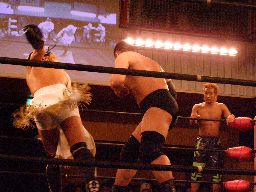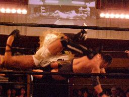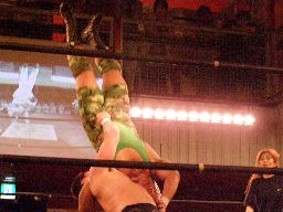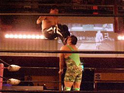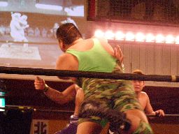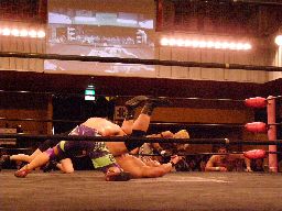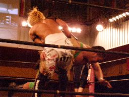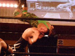 柿本と鳥羽が入ってダブルでコーナーに振る、入江は柿本をかわして鳥羽にスピアー(右写真)、柿本にもパワースラム、高木にタッチ。