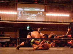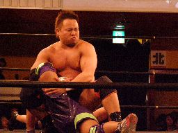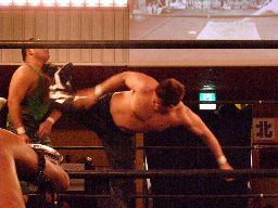 安部が高井をドロップキックで場外に落としプランチャ。柿本は入江を投げっ放しのT-bone(左写真)。カバーはカウント2。