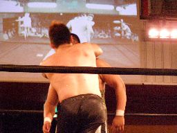 首の取り合いから柿本がヘッドロック、入江ロープに振る、柿本ショルダーブロック。入江エルボー、柿本チョップの打ち合い。ショルダーブロックの合戦から入江ロープに飛んでフライングショルダーブロック(右写真)、高木にタッチ。柿本も鳥羽にタッチ。
