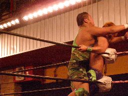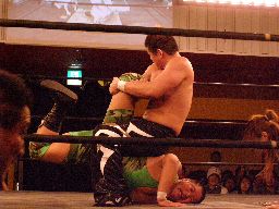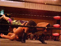 高井ボディスラムから逆片エビ(右写真)、安部ロープ。高井は高木にタッチ。