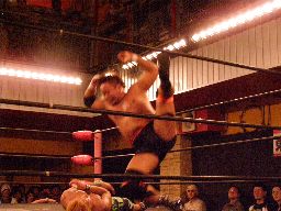 柿本コーナーに上ってミサイルキック(右写真)、カウント2。
