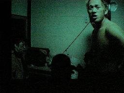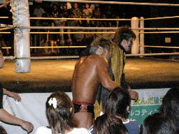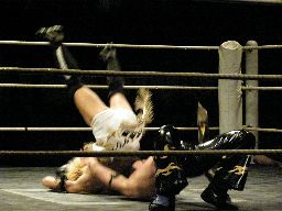 長井の頭にローションかける(左写真)。長井さん、昼の試合から比べるとなんという振り幅の広さだ。次回からアイアンフィンガー(なべつかみ)とか着けてくんのかな?
