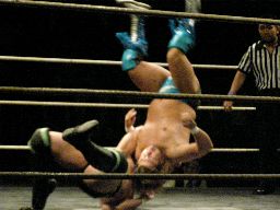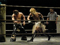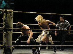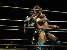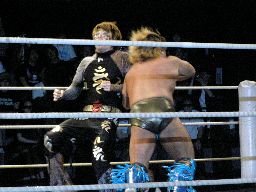 マイケルポイズンにショルダーブロック、エプロンの蛇が井にはエルボー。ポイズンをコーナーに振って串刺しエルボー(左写真)。