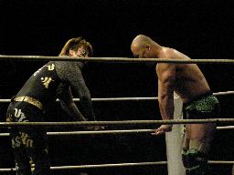 ポイズンを呼び込み松永にダブルのショルダーブロック(左写真)、さらにポイズンがセントーン、カウント2。ポイズンスリーパー、松永ロープ。ポイズンは蛇が井にタッチ。