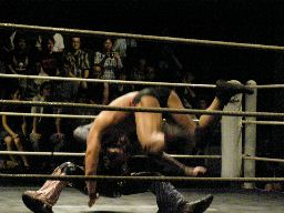 ダブルのクローズラインから蛇が井がカバー、カウント2。蛇が井ダブルアームスープレックス(右写真)、カバーはマイケルがカット。蛇が井はポイズンにタッチ。