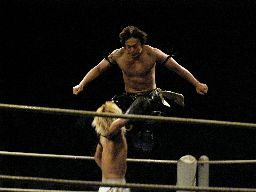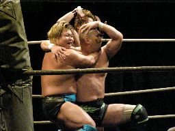 鳥羽はKUDOにコーナーに上がるよう命じ、再度ダイビングダブルニーとパンチの相打ち(右写真)。
