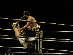 KUDOコーナーからダイビングダブルニーアタック、鳥羽は下からパンチで迎撃(左写真)。