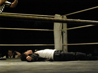 なぜか正座するMIKAMIにレフェリーのチェックが入る(左写真)。正座はダウンではないらしい。