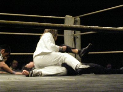 酒で勢いのついた美月はコーナーに突っ込む、MIKAMIかわしてスク〜ルボ〜イ(右写真)、カウント3。