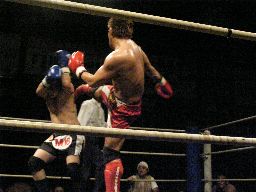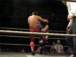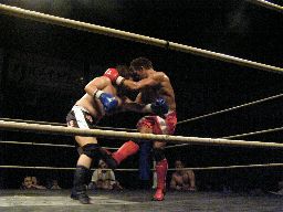 マイケルパンチ、ローキック(右写真)。2ラウンド終了。ジャッジHARASHIMAの採点はこのラウンドも10-10のイーヴン。