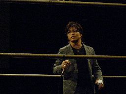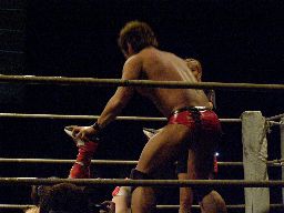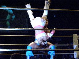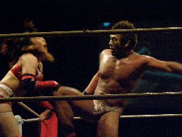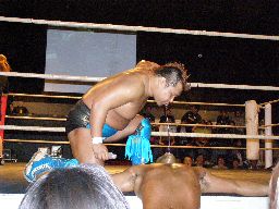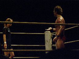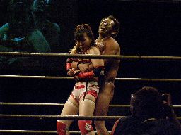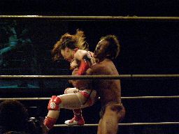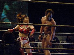 マイケルロープに飛ぶ、華名はマイケルの急所に正拳突き(左写真)。マイケル再度ロープに飛ぶ、華名もう一発正拳突き。